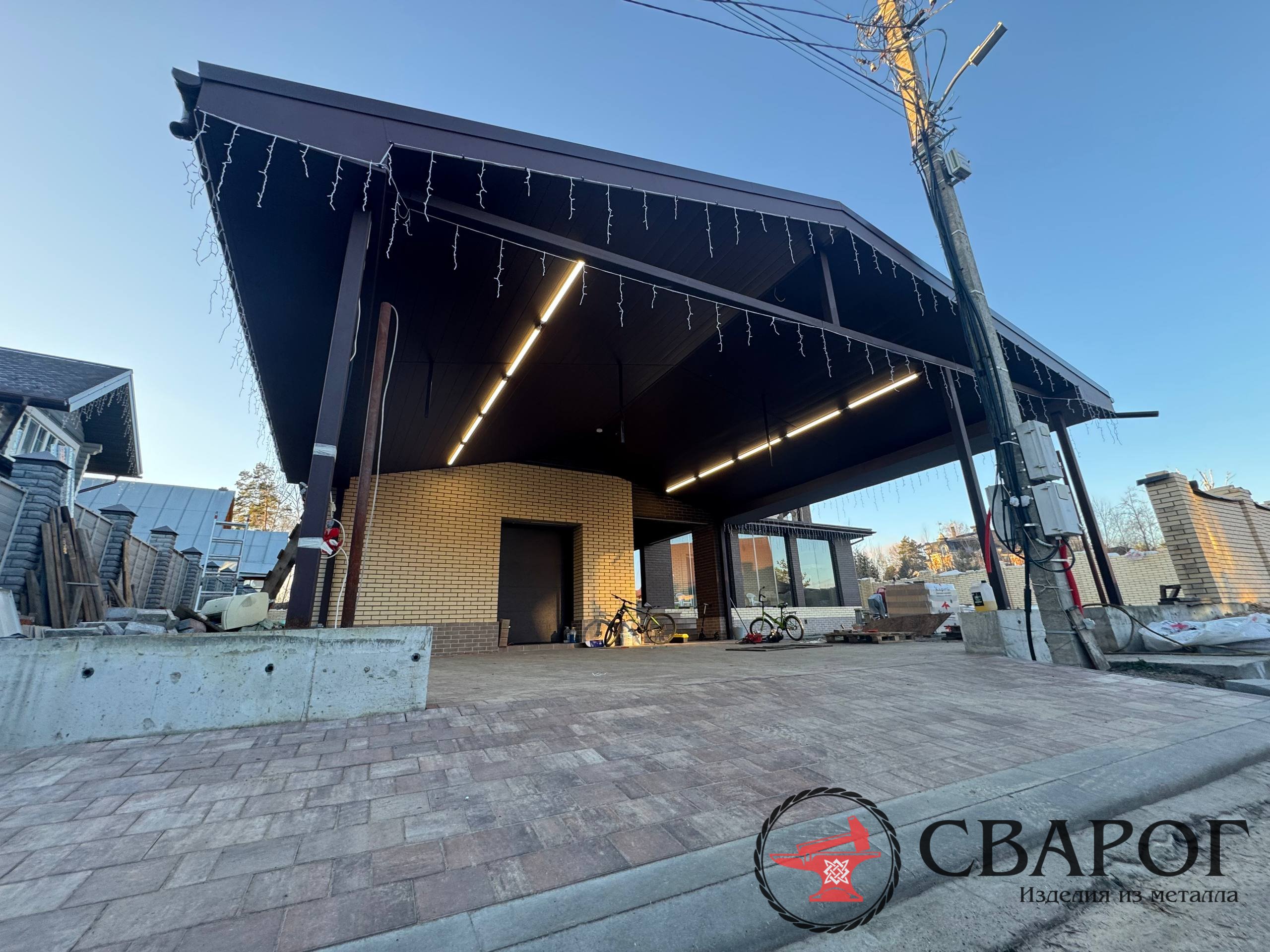 Габаритные размеры 3х2х3 метра. Перила – 5500 за погонный метр. Используются для строительства профильные трубы, стойки, карбонат, кованые элементы.